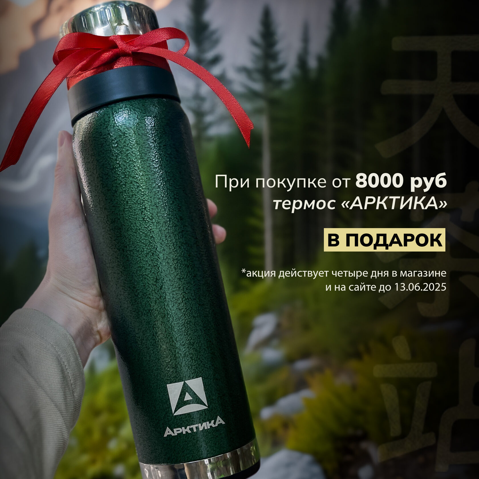 Тогда у нас для вас акция перед началом летнего сезона: при покупке от 8000/10000/12000 рублей дарим термос Арктика объёмом 0.75/0.9/1.2 литра соответственно (есть красный, серебристый, зеленый и черный цвета на выбор).